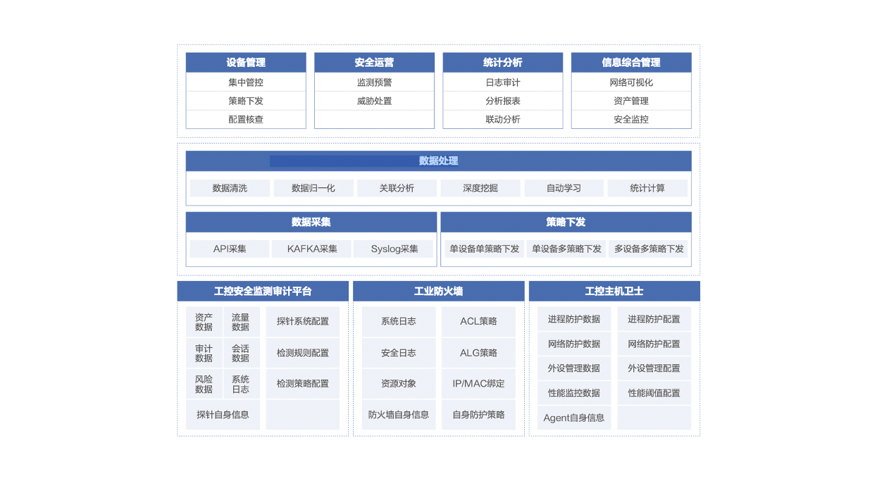 平臺通過數(shù)據(jù)采集的方式,從安全分析、環(huán)境管理和安全審計三個維度出發(fā),達到對工業(yè)控制系統(tǒng)網(wǎng)絡(luò)安全狀態(tài)的全方面監(jiān)控,幫助工業(yè)企業(yè)及時了解并處理安全問題。 -