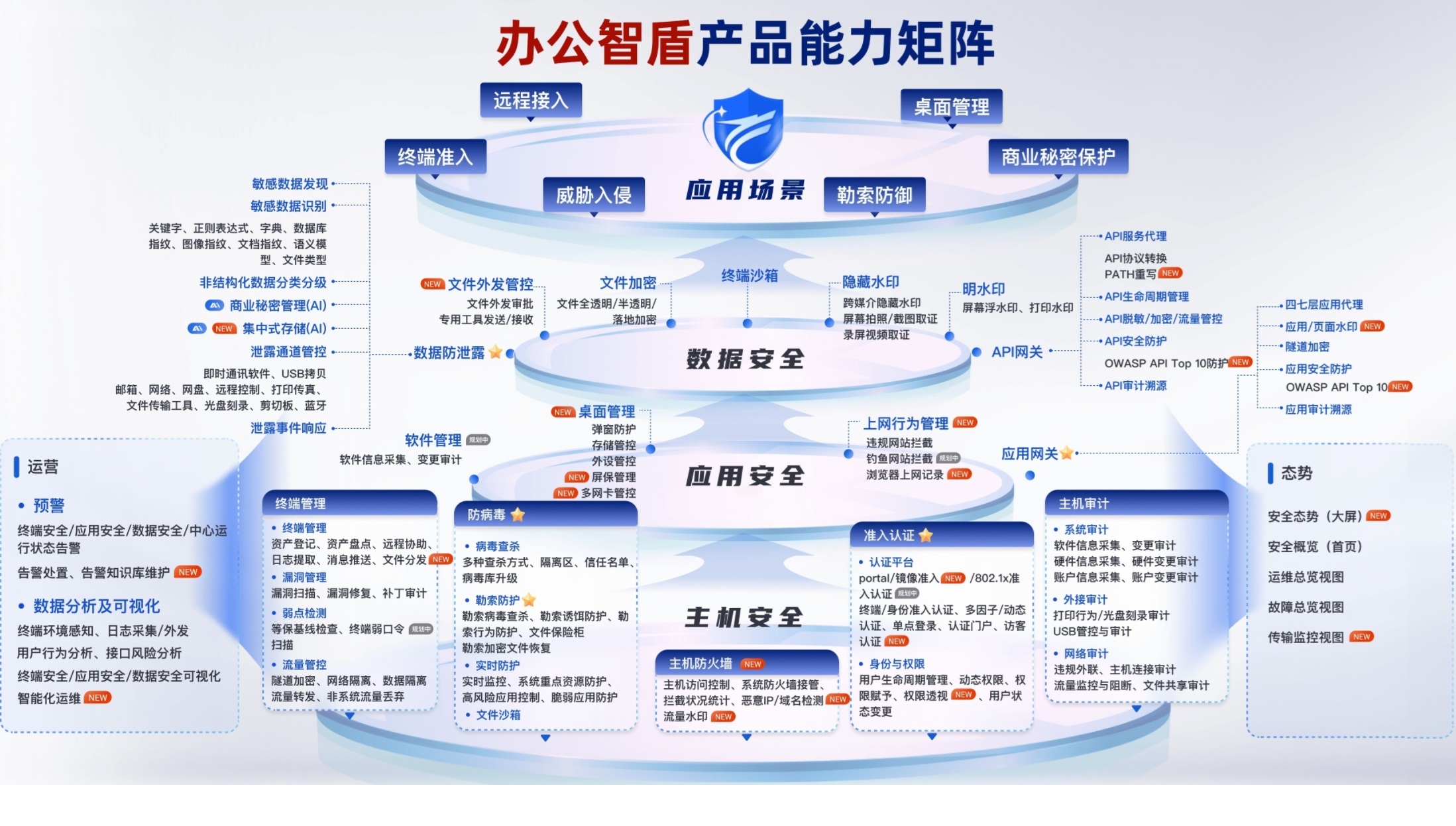 辦公智盾提出新一代的終端一體化安全防護(hù)理念和解決方案,超越傳統(tǒng)思維,從單一終端安全,變成人員、終端、網(wǎng)絡(luò)、應(yīng)用、數(shù)據(jù)全方位一體化安全。辦公智盾基于模塊化設(shè)計(jì)理念,集多種安全模塊于一體,融合了準(zhǔn)入、零信任、防病毒、數(shù)據(jù)防泄漏、數(shù)字水印、文件加密、主機(jī)審計(jì)、桌面管理等十多種業(yè)務(wù),全面兼容Windows、Linux、MacOS、UOS、麒麟等主流操作系統(tǒng),一個(gè)平臺,一個(gè)終端,統(tǒng)一管理。滿足用戶核心應(yīng)用景,包括遠(yuǎn)程接入場景、威脅入侵防護(hù)場景、商業(yè)秘密保護(hù)場景、桌面管控場景。